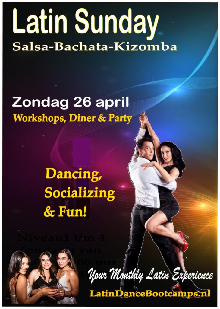 Zondag 26 april: Latin Sunday. Een gezellige Latin Party in de sfeervolle zaal van De Estafette in Nieuw Vennep. We gaan van start met leuke, leerzame workshops daarna nemen onze resident DJ’s het over. Zij laten hun mooiste Salsa, Bachata en Kizomba muziek horen.
